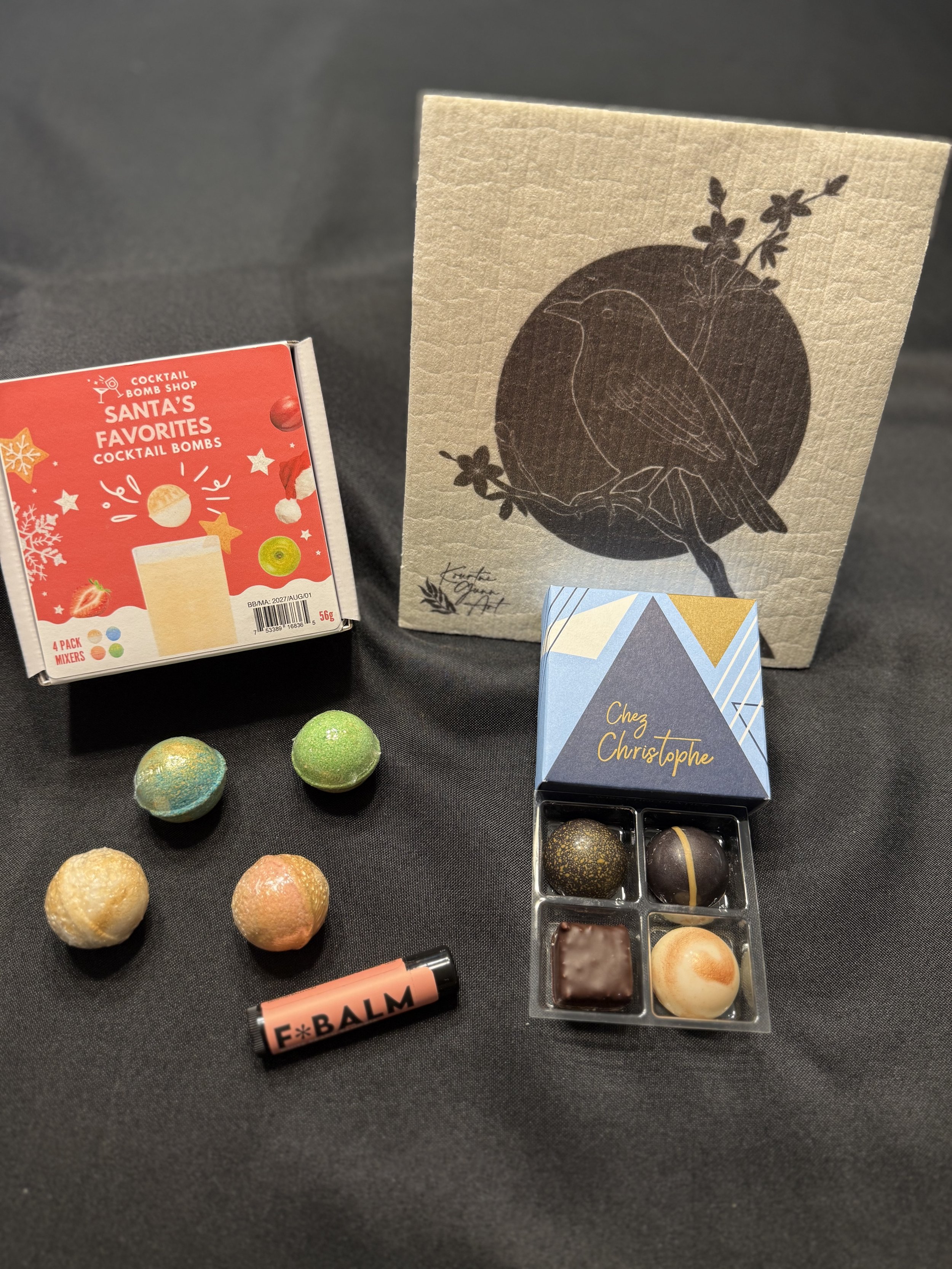 Inside, you’ll find a soft, stylish scarf, four of Santa’s favorite cocktail bombs, an eco-friendly Swedish dishcloth featuring artwork by local artist Kourtni Gunn, locally made lip balm, and beautifully balanced olive oils and balsamic vinegars. It’s the perfect blend of cozy, practical, and indulgent — a basket that makes gifting drastically better.